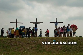 MANILA-FILIPINA (voa-islam.com) – Uskup Agung Filipina berang! Tepat pada hari Jumat Agung beberapa waktu lalu, para gadis turis berpose narsis dengan pakaian tak senonoh di atas kayu salib. Padahal salib itu dipersiapkan untuk ritual peringatan hari kematian Yesus Kristus yang mereka yakini sebagai Tuhan.